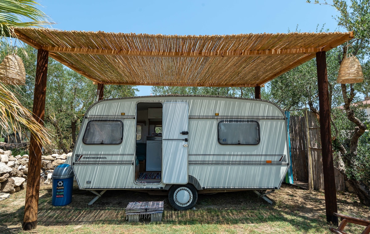En un refugio de verdor, rodeado de pájaros , le damos la bienvenida en armonía entre un mínimo de confort "moderno" y una forma de "volver a lo básico", todo en un espacio acogedor simple y natural. Una caravana con cocina totalmente funcional, sala de estar y baño con una cama doble. El aire acondicionado y el wifi gratuito te mantienen fresco y conectado. ¡Te damos la bienvenida a todos, jóvenes y viejos! ¡La amabilidad, la disponibilidad, la amabilidad y el estilo de vida griego son completamente GRATUITOS en nuestro hogar y familia! Mis mejores deseos de Annay Panagioti