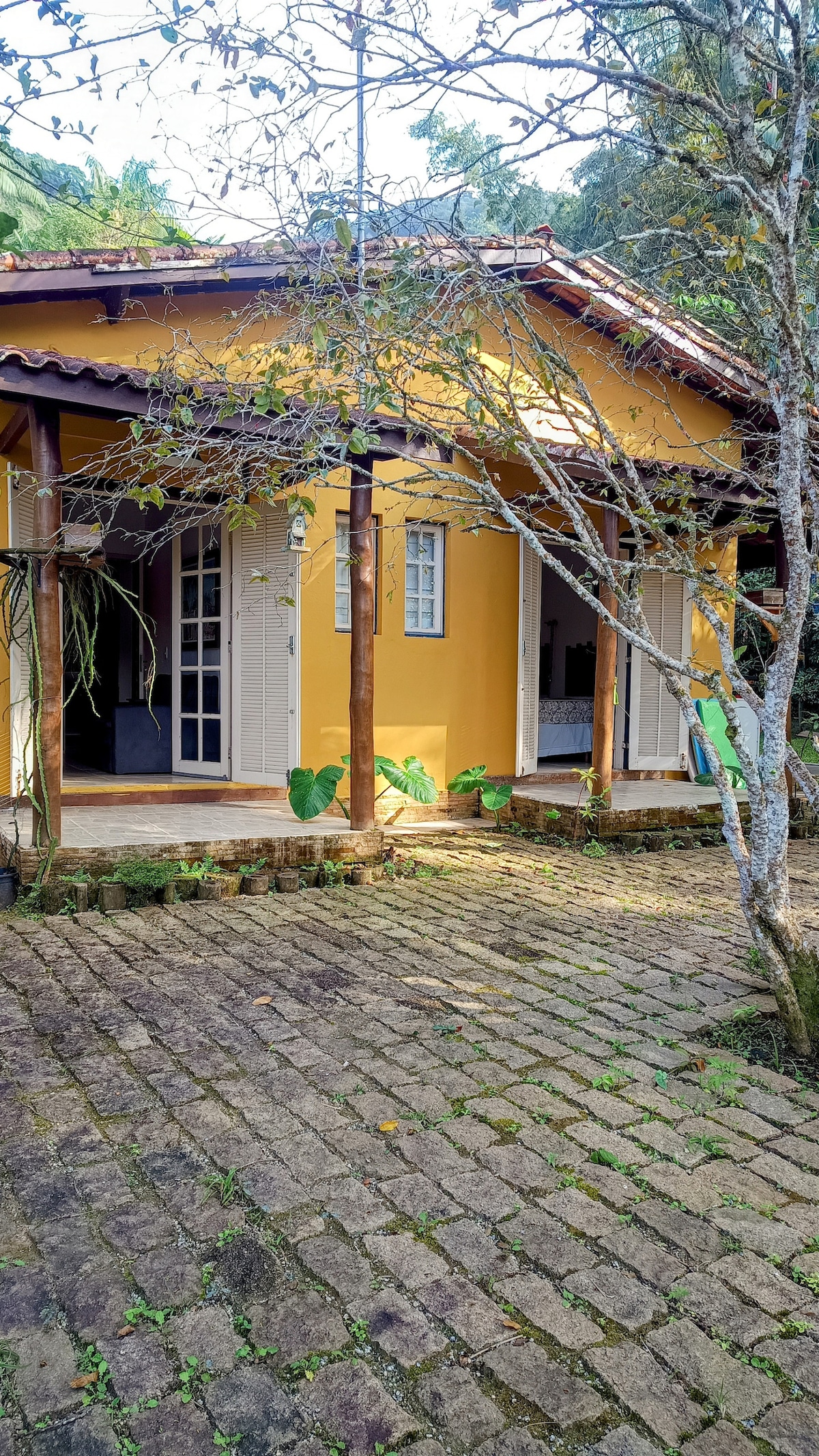 Chalé charmoso em frente ao mar com sala conjugada com cozinha e sofá cama, um quarto, uma varanda ampla, um banheiro completo, jardim com chuveirão e muitas árvores, wifi de alta velocidade. Acesso à casa caminhando (10 min) desde o estacionamento de carros (Rua Maria Caetana). Ajuda para transporte das bagagens.