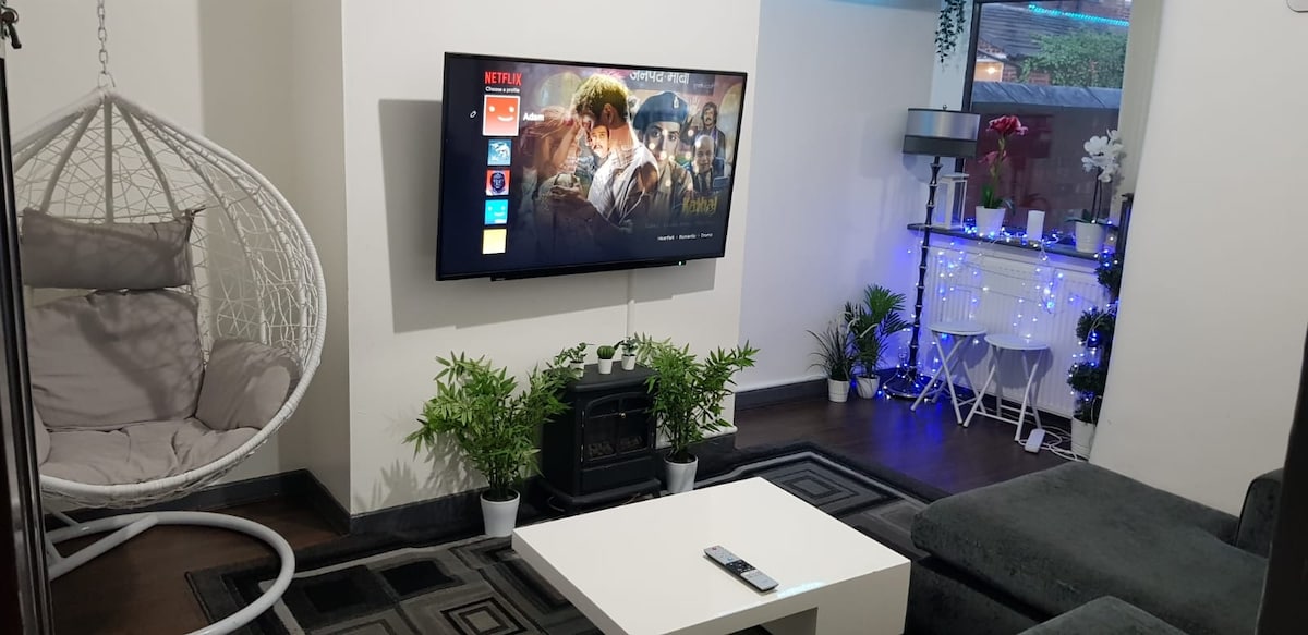 Relájate en este espacio tranquilo y elegante. Amplio salón, dormitorio privado, baño privado con cabina de ducha. Pequeña sala de estudio separada con escritorio y silla. El salón es espacioso con TV grande, cómodos sofás para relajarse después de un día ajetreado. Wifi en todas las áreas. La propiedad está ubicada en una calle sin salida, por lo que es muy tranquila. Estacionamiento privado frente a la propiedad. Cerca del centro de Manchester y del aeropuerto de Manchester, perfecto para pasar la noche antes o después de un vuelo.