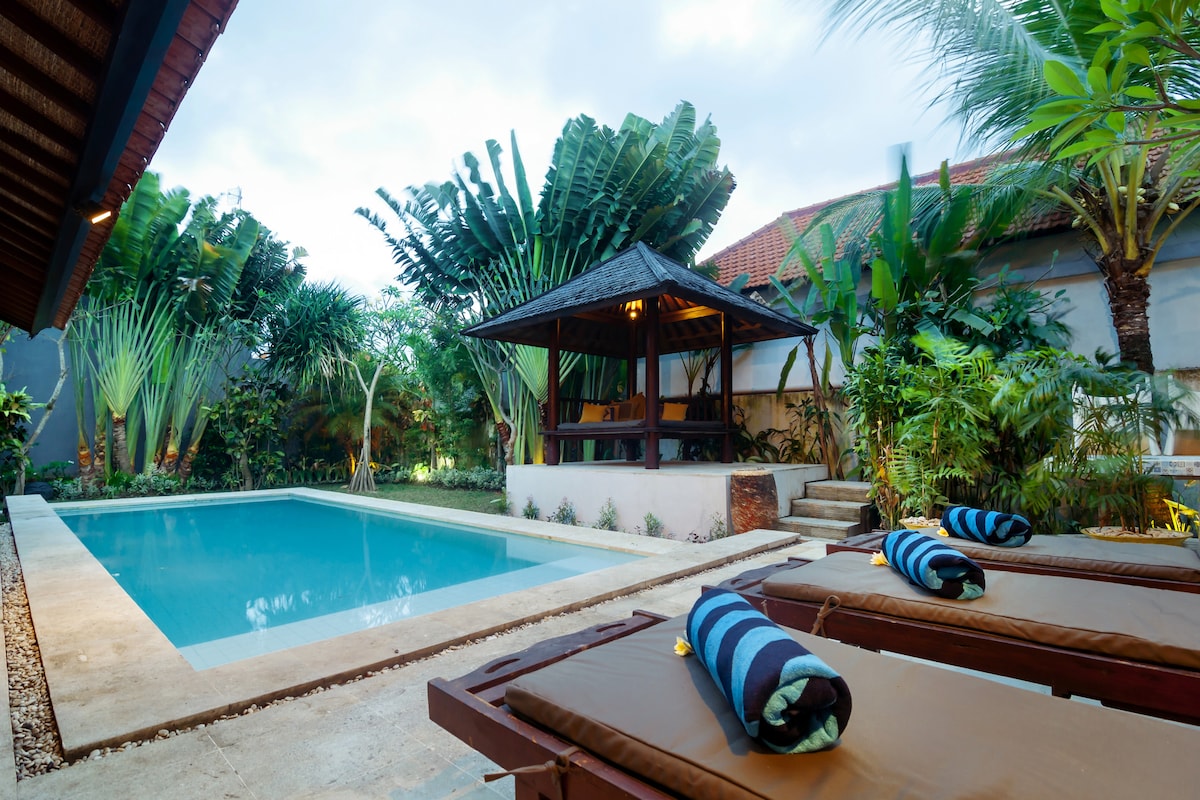 Immerse yourself in a peaceful green retreat in the vibrant heart of the coolest areas of Bali. This charming two-ensuite bedroom villa is just 15 minutes from the beach and surrounded by amazing bars, restaurants and beach clubs. Start your day with a refreshing swim in the large private pool, enjoy breakfast under the shade of swaying palm trees, and relax in the open tropical living area. Experience the perfect balance of relaxation and excitement in one unforgettable location.