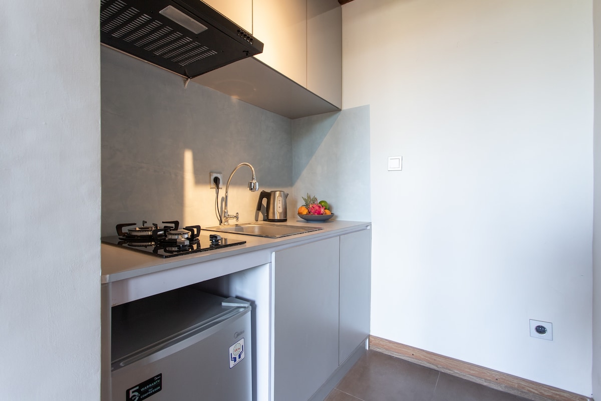Bienvenido a este impresionante estudio recién construido, ahora disponible. Estudio independiente, elegante y espacioso. Impresionantes vistas, entrada privada, cerca de la playa en el corazón de Canggu. Cama tamaño king Cocina Totalmente Equipada Amplia sala de estar con sofá cama que podría utilizarse como segunda cama. Escritorio/zona de trabajo Baño Entrada independiente. Pantalla de cine con proyector Sonido envolvente estéreo Aire acondicionado: mantente fresco y cómodo con el aire acondicionado. Cortinas opacas del suelo al techo Nevera llena Limpieza diaria