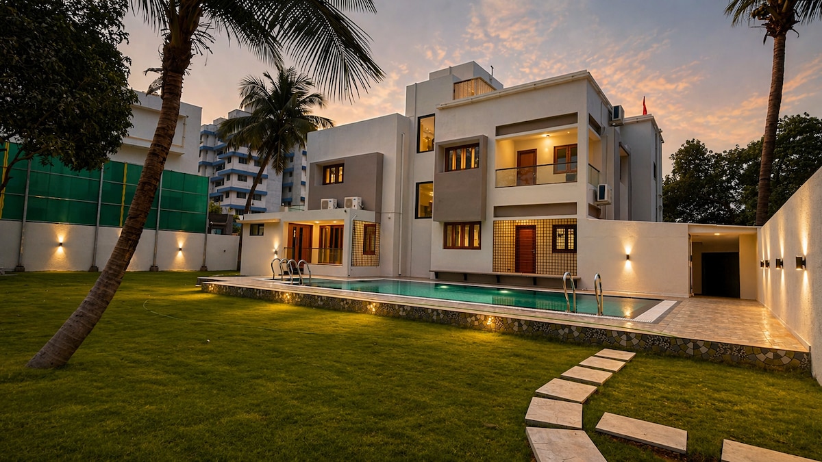 Experience luxury at Manshila, a premium 5BHK villa in Daman. Featuring a private pool, bar counter, lush garden, and stylish lounge, it’s perfect for relaxing getaways. Rooms include attached bathrooms, walk-in closets, and bathtubs. Enjoy breakfast, meals on request, free WiFi, and ample parking, just 2.5 km from the beach and city.