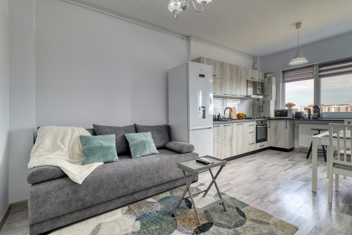El alojamiento tiene 2 habitaciones y está dividido de la siguiente manera: - Comedor y cocina. - Habitación con cama tamaño king. - Baño con tina - Balcón abierto. El edificio está ubicado en la zona antigua de la comuna de Chiajna, rodeado de casas y edificios con bajo nivel de altura, lejos de la zona concurrida del nuevo barrio (Militari Residence) El departamento se completó en 2025 y todos los servicios son nuevos Calefacción propia, aire acondicionado, cocina totalmente equipada y todo lo necesario para una estancia corta o prolongada.