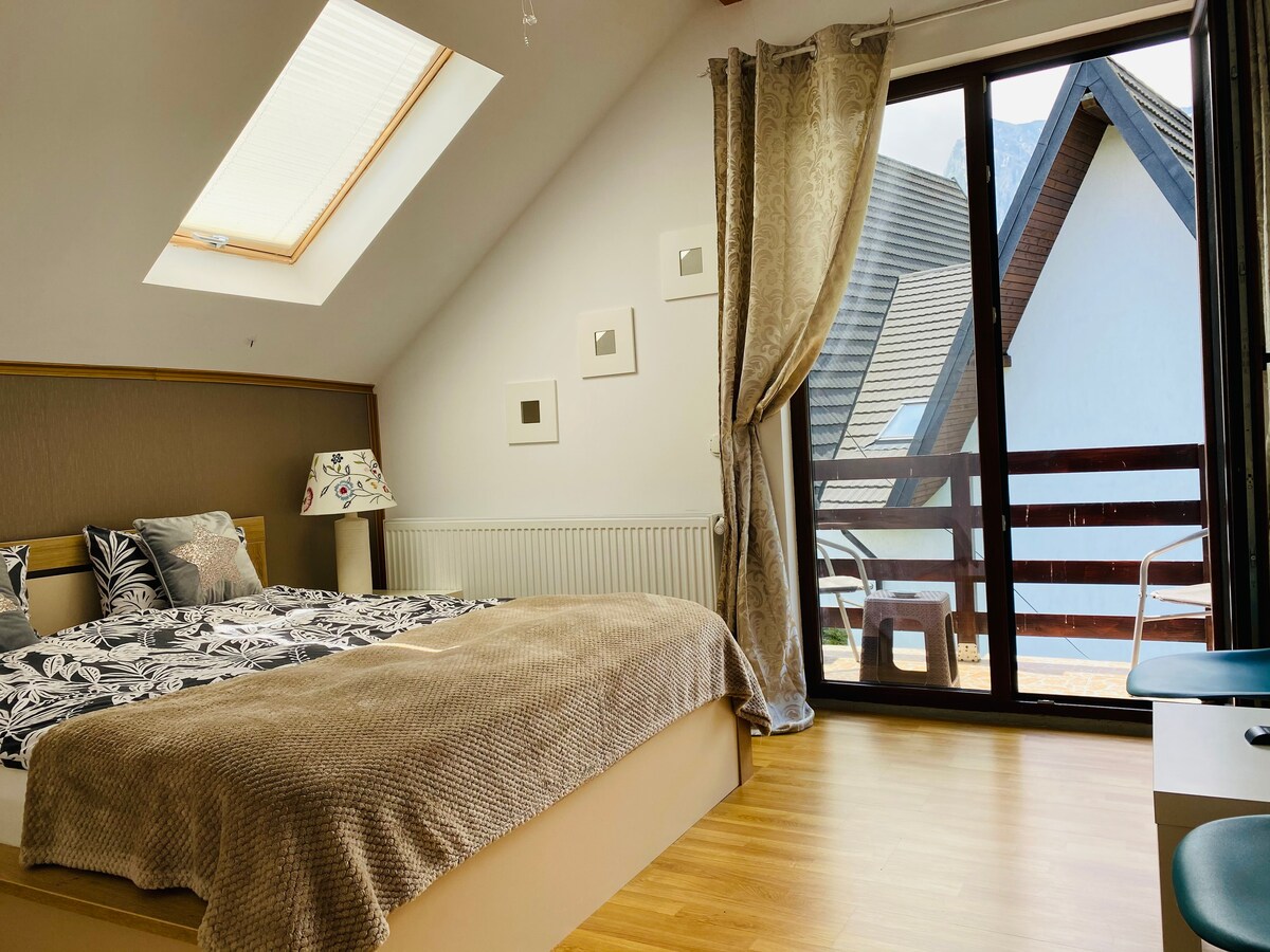 Bienvenido a nuestro acogedor chalet, con vistas a las majestuosas montañas de Bucegi. Nuestro chalet es perfecto para cualquier tipo de vacaciones o para aquellos que quieran trabajar desde casa. La cocina de espacio abierto y la sala de estar con estufa de leña son perfectas para acurrucarse con un libro o trabajar en tu ordenador portátil. Ofrecemos wifi gratuito para que puedas mantenerte en contacto con tus seres queridos. El baño cuenta con ducha y el dormitorio tiene un pequeño balcón que ofrece unas vistas impresionantes de las montañas Bucegi.