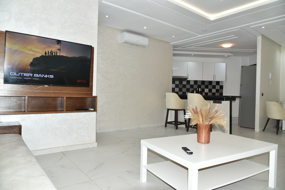 ¡Ven a vivir una experiencia memorable! Suntuoso apartamento de 2 dormitorios con camas king-size y una luminosa sala de estar con capacidad para 2 camas adicionales. Equipamiento: Fibra óptica de 100 MB Aire acondicionado centralizado 2 televisores con IPTV 2 baños con ducha Cafetera, lavadora y lavavajillas Aparcamiento en el sótano Balcón privado. Capacidad máxima: 6 personas. Situado en la tranquila zona de Mimosa, a 7 minutos a pie de la estación de tren de Kenitra y a 20 minutos de la playa de Mehdia.