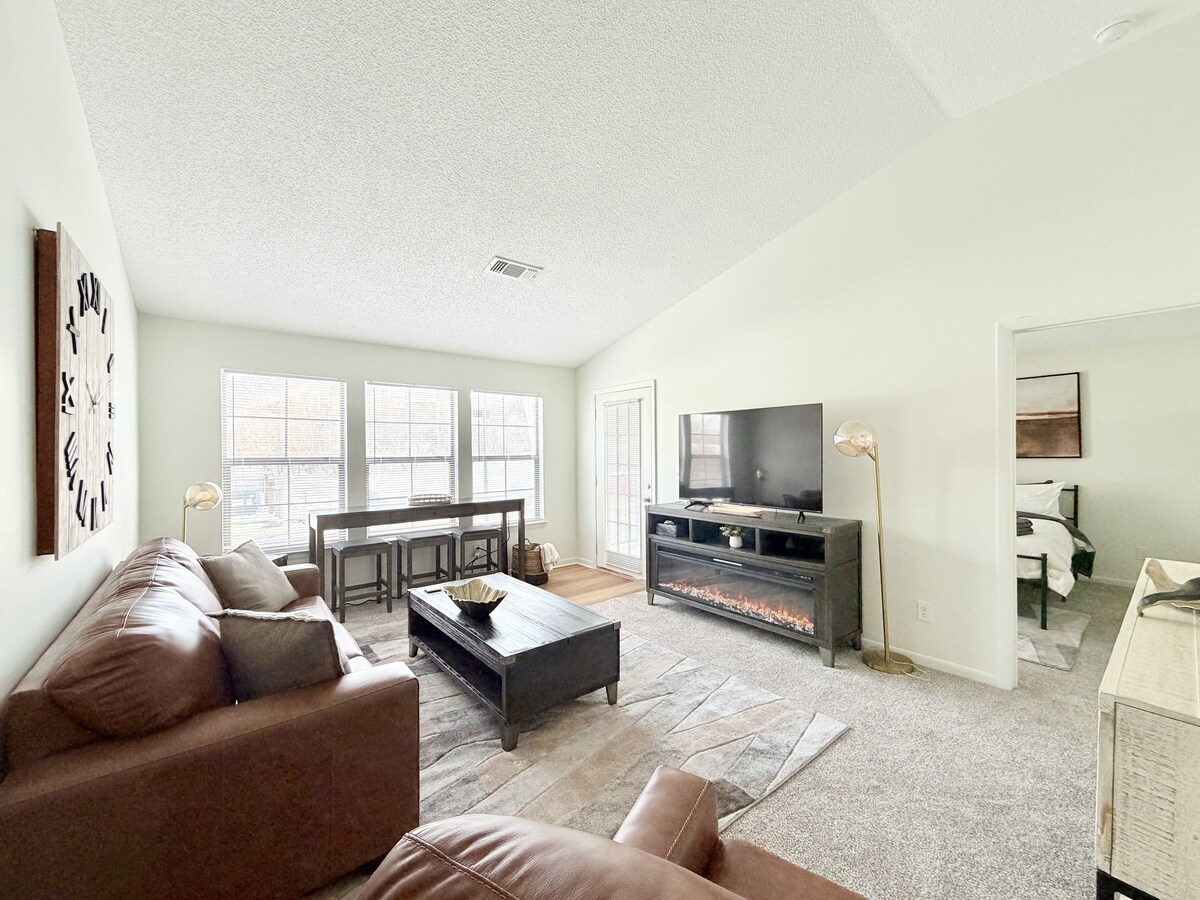 Disfruta de una experiencia elegante en este lugar céntrico. Cuenta con cama tamaño king + sofá cama (capacidad para 3 personas), cocina completa, chimenea y wifi. Relájate con piscina, gimnasio, parrilla en el patio trasero, chimenea y estacionamiento gratuito. Cerca del centro de convenciones de Sharonville, autopistas, empleadores, tiendas y restaurantes. Incluye TV inteligente, acceso a lavadora/secadora, aire acondicionado/calefacción. Estadías flexibles de más de 30 días para profesionales, familias y enfermeras de viaje. ¡Comodidad y conveniencia listas para mudarse!