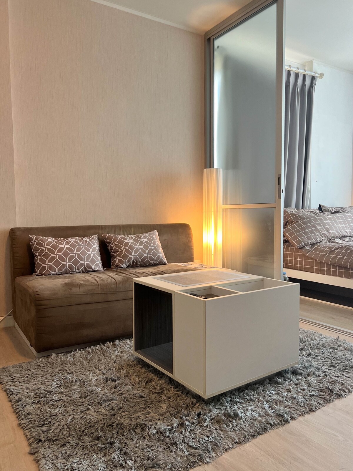 Disfruta de tu sala de estar de Chiangmai - Apartamento de un dormitorio en un condominio completamente nuevo. Ubicado en una ubicación privilegiada justo al lado del centro comercial más grande "Festival Central" a pocos pasos o servicio de traslado. Puedes relajarte el día con nuestras elegantes instalaciones en la azotea: piscina infinita/gimnasios/sauna de piedra caliente/ Sky Lounge con una maravillosa ciudad de paisajes de montaña. Vivir en un acogedor dormitorio, sala de estar y cocina completa. Mezcla de comodidad y conveniencia, lo que te hace sentir como en casa.