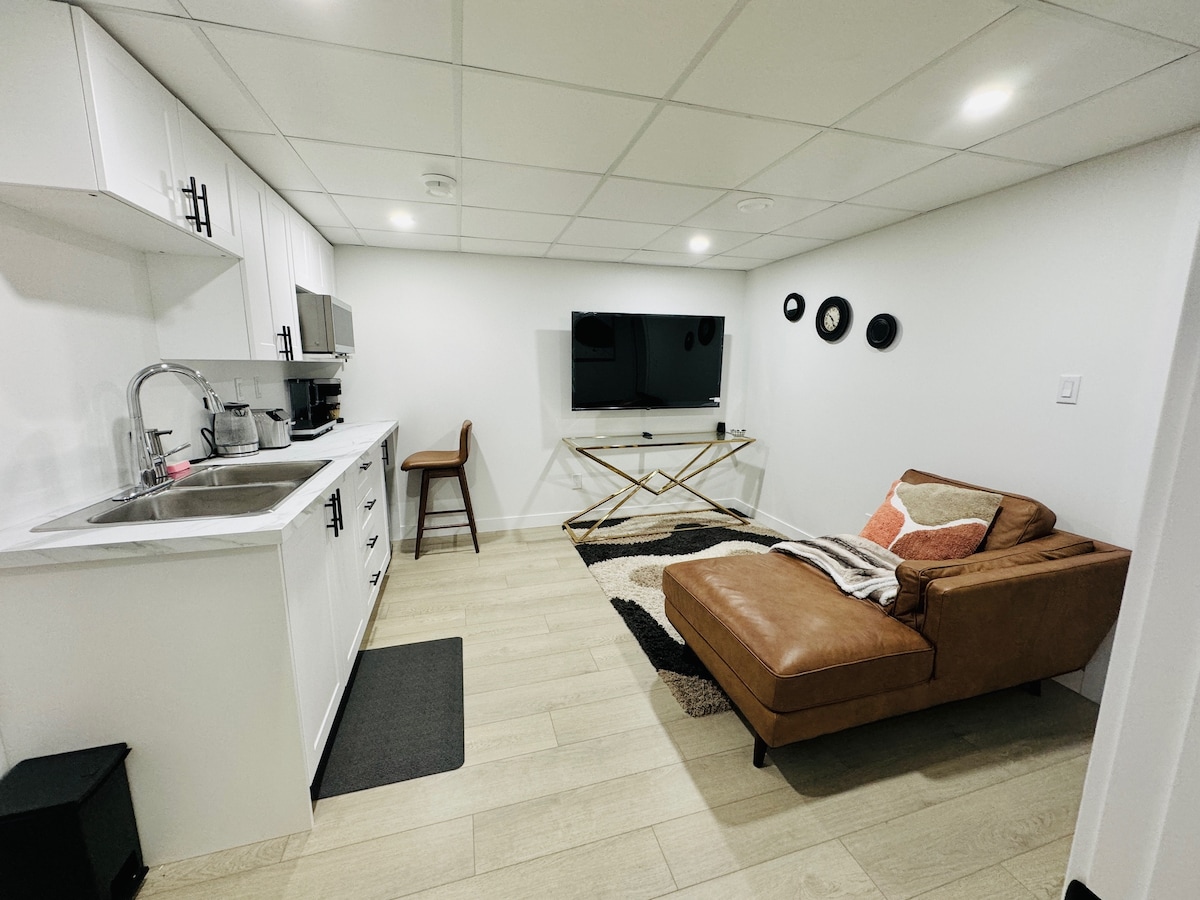 Hemos creado un ambiente cálido y acogedor con la comodidad de los huéspedes en mente. Si estás aquí para explorar, relajarte y/o simplemente disfrutar de un cambio de escenario, esta suite de 1 dormitorio cuenta con una acogedora cama tamaño queen, baño, sala de estar, cocina pequeña equipada y un comedor diseñado para ofrecerte más que solo un lugar para dormir. Ofrece un ambiente cálido y relajante que hace que cada momento se sienta tan especial. A pocos minutos en auto de los centros comerciales para comprar todo lo que puedas necesitar y estacionamiento gratuito en la entrada.