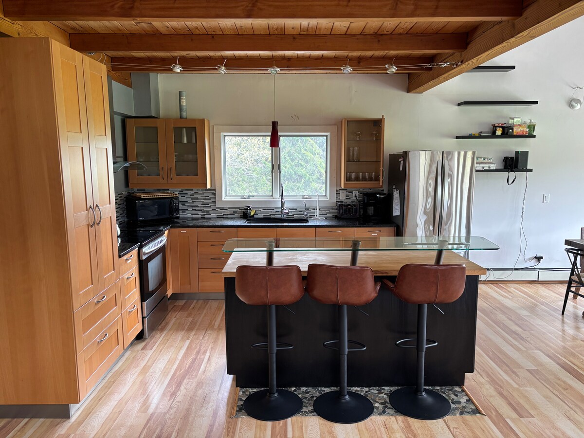 Our modern log home is set up with fine things like Turkish towels, local artisan soaps & the softest sheets. The tasteful decor has an mcm vibe w/industrial touches. Wander outdoors, swim, follow a creek, slip into the forest, hike back, cook dinner in a state of the art kitchen w/ a pantry full of fun gadgets. Relax by the fireplace, sit outside & watch the stars, light a fire. We provide blankets & wood. A welcome basket & a fully stocked coffee bar for the early mornings are waiting for you.