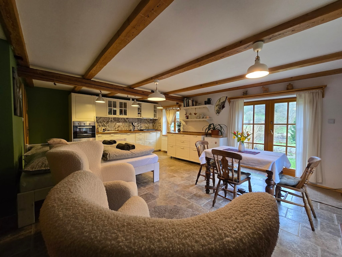 Disfruta de una estancia tranquila en una parte separada de una casa rural para un máximo de 11 huéspedes. Rodeado de naturaleza, con animales (ovejas, vacas, caballos, gallinas, conejos y un perro amable) y un gran jardín parcialmente compartido. El anfitrión vive en la misma propiedad y estará encantado de ayudarte si es necesario, pero respeta plenamente tu privacidad. El centro de la ciudad, con cafés, restaurantes y tiendas, está a solo unos minutos en auto, así como el castillo de Děčín, el cañón del Elba y el Parque Nacional.