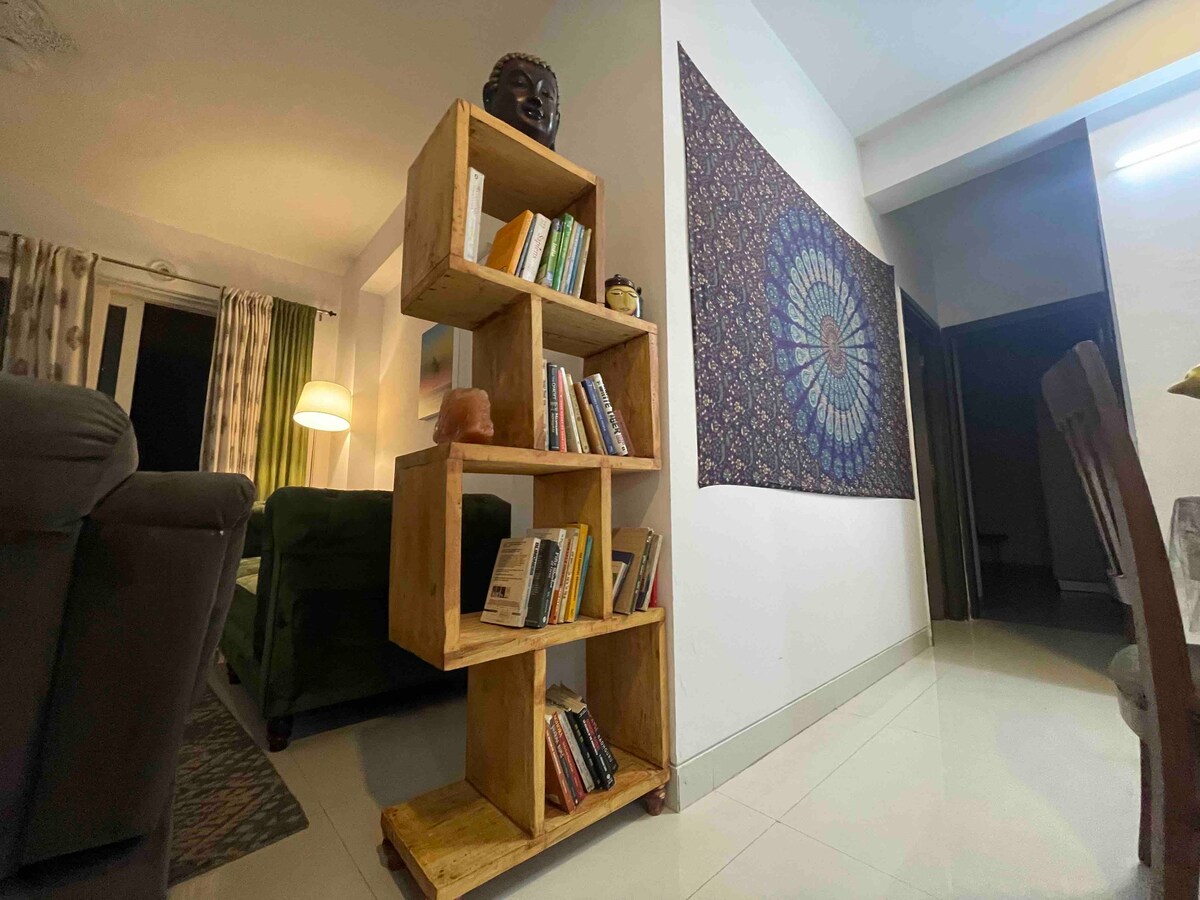 Una acogedora casa de 2BHK con una vista sacada de una película: mira las puestas de sol, los arco iris y el Himalaya desde tu balcón con vistas a un campo de golf de 9 hoyos. Perfecto para parejas y familias, cuenta con un espacio de trabajo designado con sillas ergonómicas, muebles cuidadosamente seleccionados y arte. La sala de estar está hecha para noches de Netflix con un sistema de sonido, wifi de alta velocidad y una cocina totalmente equipada para la comodidad del hogar. A 15 minutos de la carretera de Rajpur.