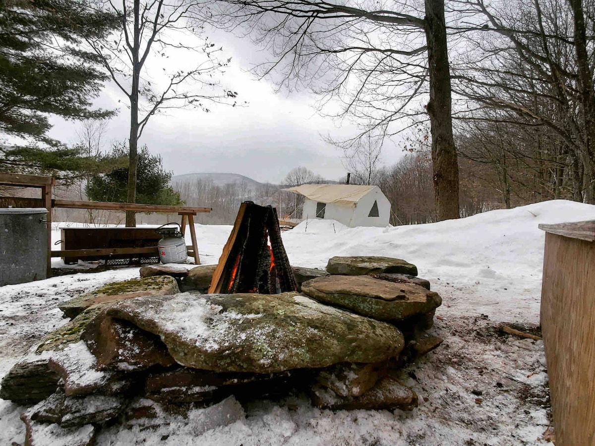 Nuestra tienda de lona sin conexión a la red está situada al borde de un prado, rodeada de arbustos de arándanos. Está a solo 4,5 millas de Main St en Livingston Manor y a 35 minutos de Bethel Woods. Ofrecemos una cama de tamaño completo (con colchón con calefacción), chimenea, leña, calentador de propano y energía solar. Tienes acceso a un baño exterior privado con inodoro de compostaje y ducha al aire libre en el lugar, y a un baño compartido convencional si lo prefieres. Somos un espacio inclusivo LGBTQ+.