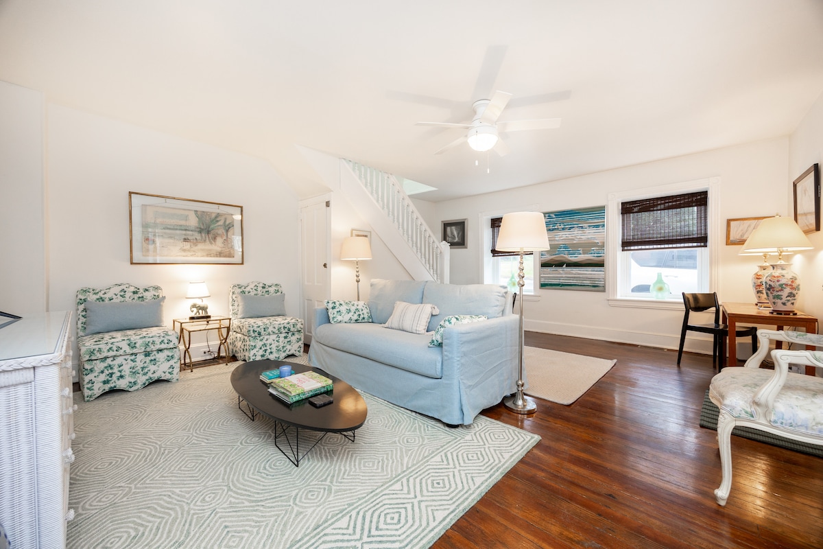 Blue Tranquility is the first floor apartment (apartment A) in a two unit apartment building. It is a cozy one bedroom unit with a large covered porch located on the grounds of the famous Egyptian house. The unit is comfortable for 2 people but will accommodate 4 with the living room couch converting to a bed. The property is conveniently located with plenty of off street parking.