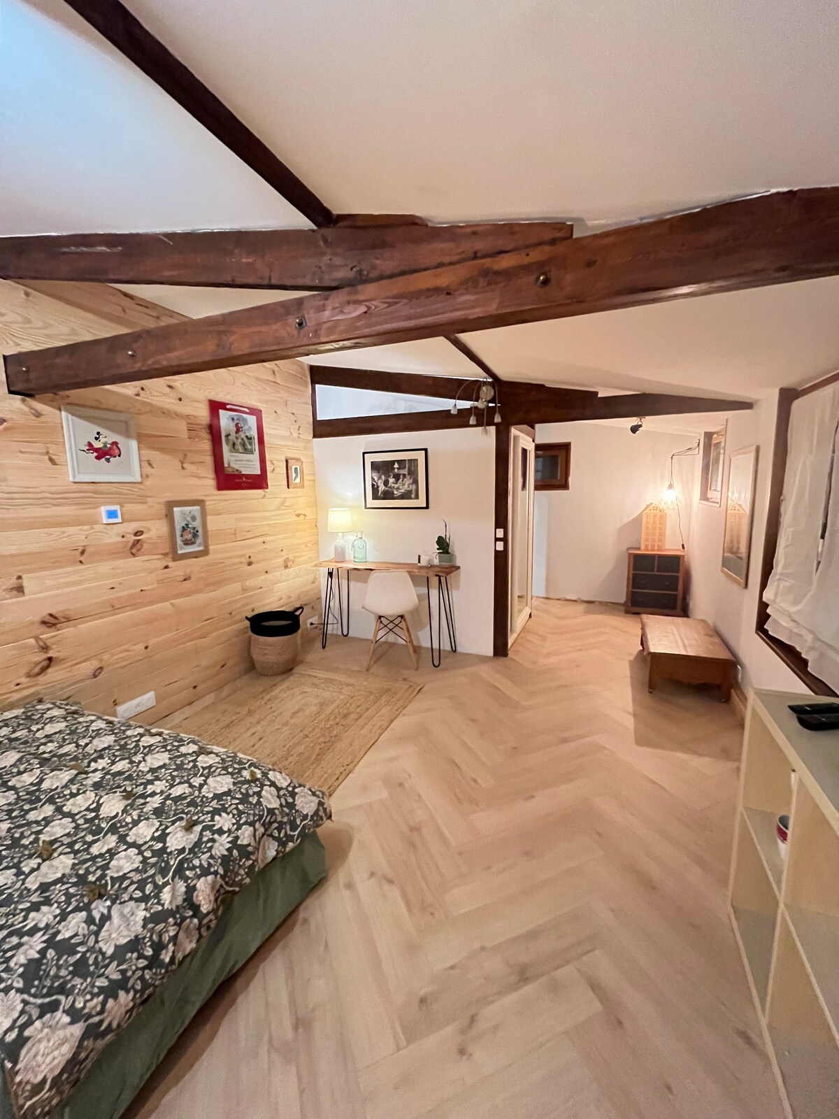Casa en 2 niveles que consta de una gran cocina, una sala de estar, comedor, 4 dormitorios grandes, un baño con ducha y bañera e inodoro en la planta baja y arriba. Para los amantes de la pintura abstracta, la casa está decorada con múltiples lienzos de colores que embellecen los espacios habitables. Una terraza, un salón de verano y un jardín a la sombra conforman el exterior para momentos agradables.