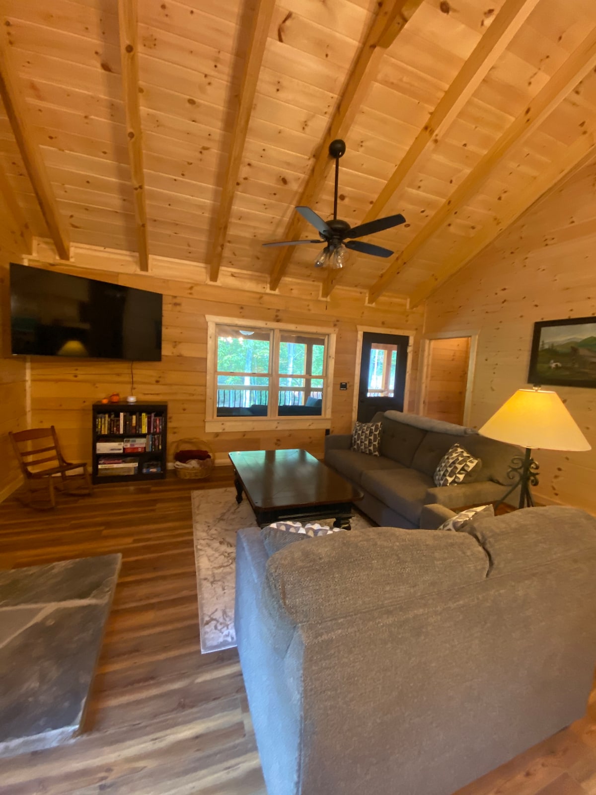 Relájate en este refugio tranquilo y romántico, perfecto para una pareja o una familia pequeña. El elegante dormitorio cuenta con una cama tamaño king y TV, mientras que las literas para adultos ofrecen un espacio acogedor para leer o un huésped adicional. Disfruta de una ducha de azulejos de lujo, una cocina completa con electrodomésticos principales y una habitación principal con una pared de ventanas. Relájate en la terraza privada y disfruta de las impresionantes vistas a la montaña. Una escapada serena en el corazón de la naturaleza.