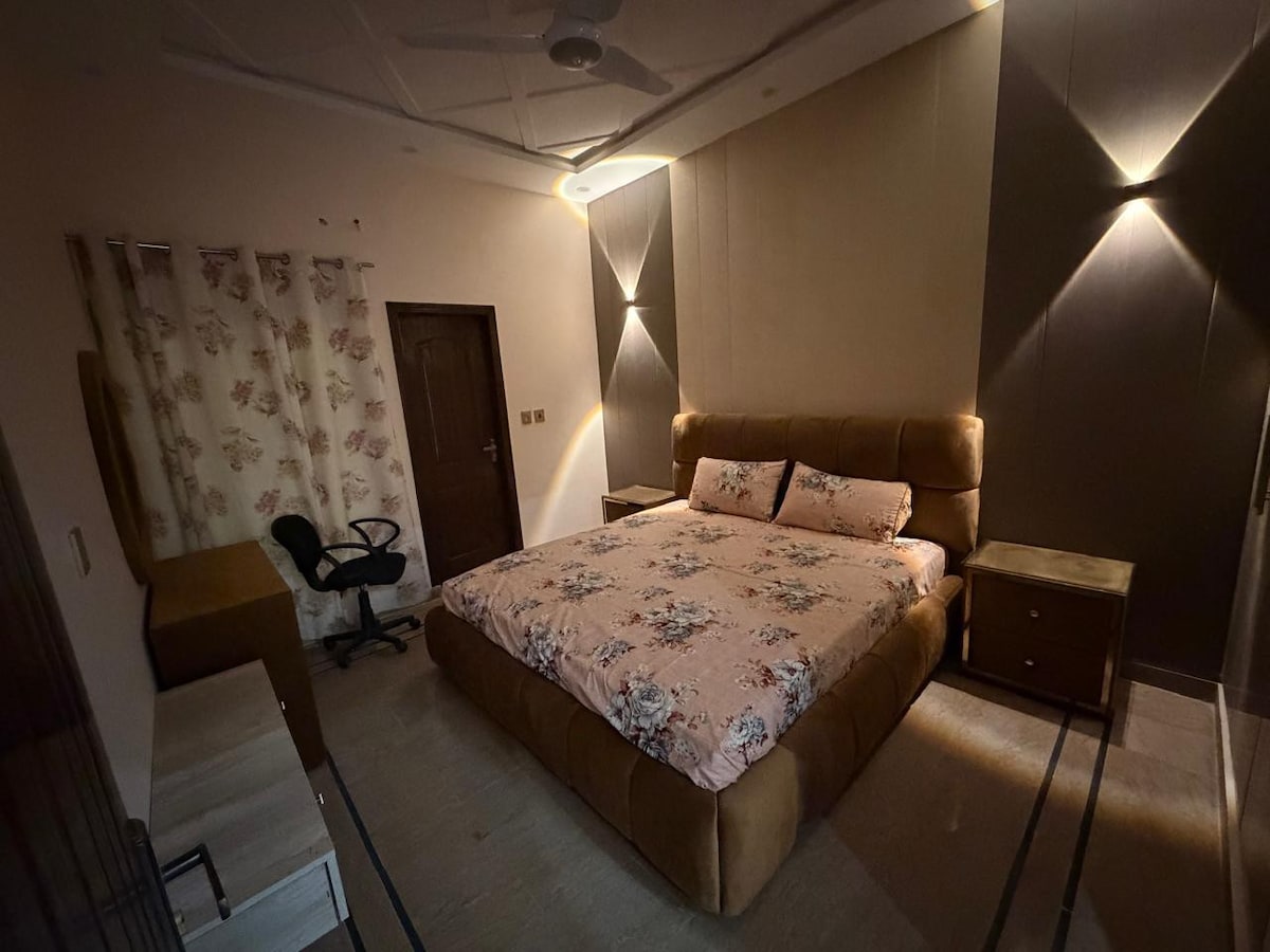 La casa está en el centro de Lahore. Tiene tres dormitorios con armarios y baños, un gran salón y una gran cocina, televisor y un lugar adecuado para planchar. Tiene una entrada automática + llave para que puedas elegir cualquiera. También obtienes un guardia de seguridad/ayudante gratuito las 24 horas del día, los 7 días de la semana. Los aires acondicionados de los tres dormitorios están incluidos en el precio. Defence (DHA)/Packages Mall: 10-15 minutos Wapda Town/Emporium: 5-7 minutos Gulberg: 5-10 minutos Aeropuerto: a 20 minutos como máximo. Terminal de autobuses Daewoo: 10-15 minutos Model Town: 5-10 minutos