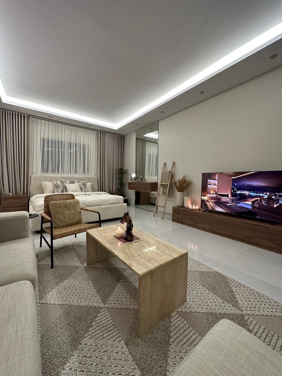 استوديو أنيق ومتكامل بتصميم عصري وفاصل خشبي يمنح خصوصية بين النوم والجلسة. المكونات: -سرير ماستر بفراش فاخر -جلسة خلف فاصل خشبي تضم أريكة وطاولة قهوة - زاوية ضيافة تحتوي على ماكينة قهوة، غلاية، أكواب، وقهوة وشاي -مطبخ صغير بثلاجة، مايكروويف، مغسلة وخزائن - دورة مياه واسعة بدش مطري وتجهيزات أساسية الخدمات: -واي فاي عالي السرعة - شاشة ذكية بنظام LG -ضيافة بـ3 أنواع قهوة وشاي الموقع: -مطار الملك خالد: 20 دقيقة -بوليفارد رياض سيتي: 6 دقائق - بوليفارد وورلد: 6 دقائق -المملكة أرينا: 6 دقائق