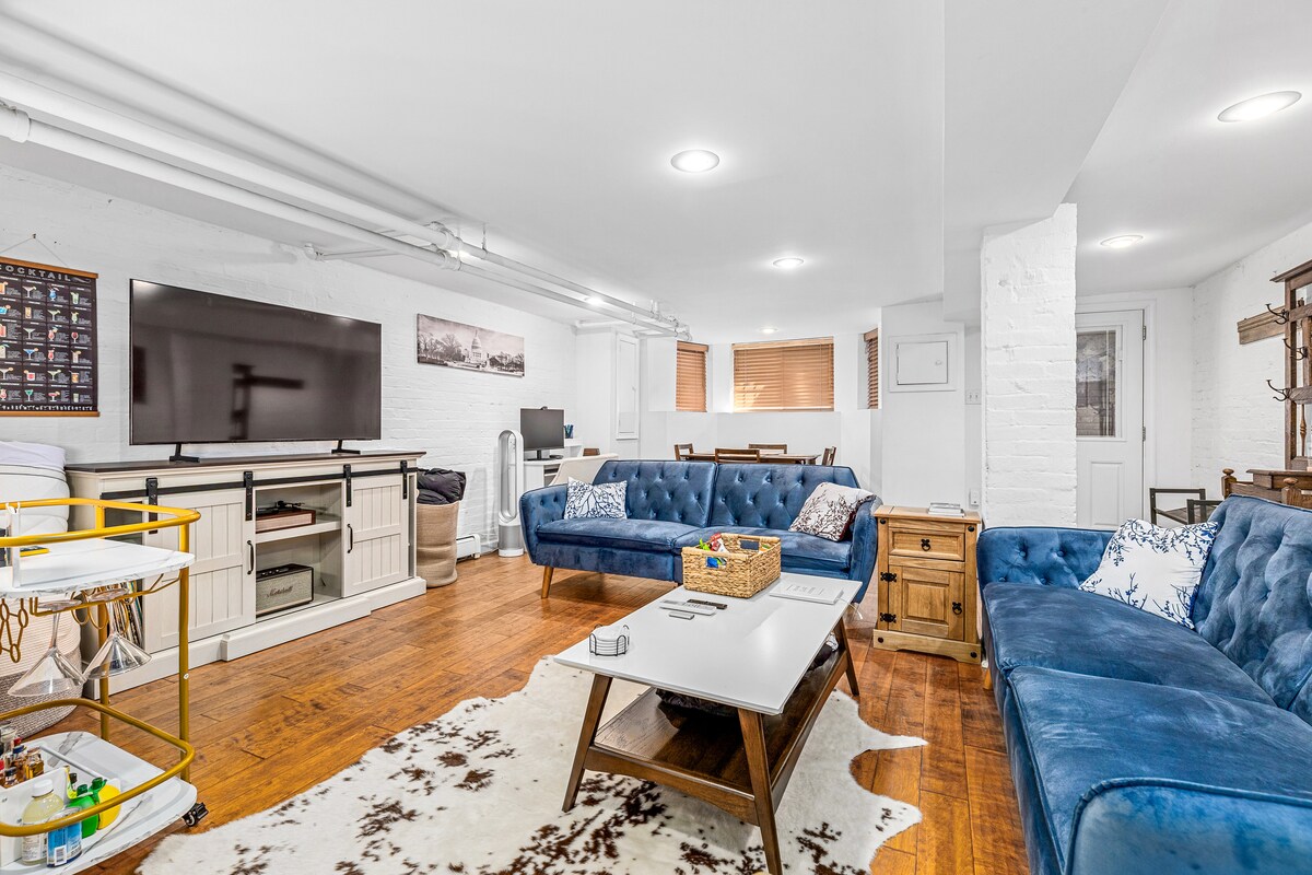 ¡Disfruta de un refugio en un apartamento en el sótano recientemente renovado en DC con estacionamiento gratuito en la calle y acceso conveniente a todo el bullicio del centro de la ciudad! Los servicios incluyen cerradura inteligente/alarma que permite el auto check-in/check-out; amplio dormitorio con cama tamaño queen Duxiana; sala de estar con cómodo sofá y televisor inteligente; moderno baño recién renovado; cocina completa con cafetera, hervidor de agua, nevera, estufa/horno y microondas; y lavadora/secadora.