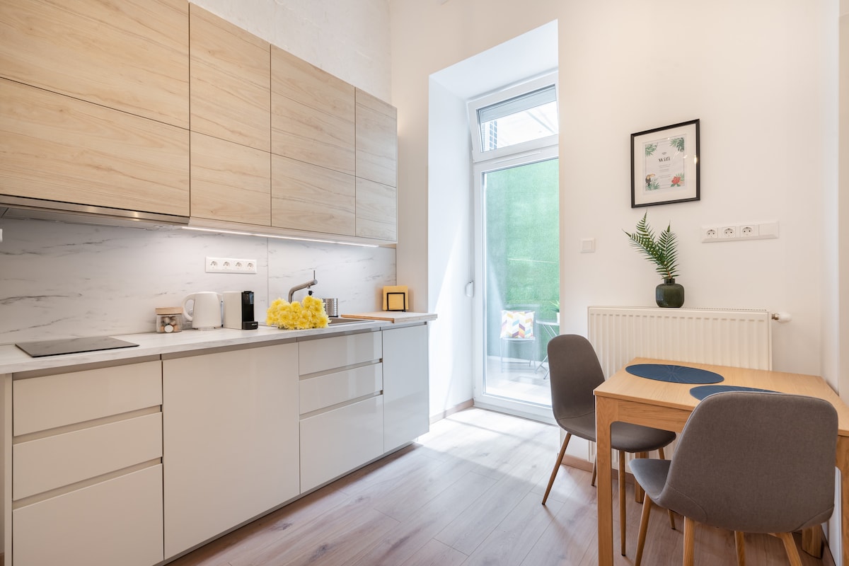 Una casa elegante y única espera a los huéspedes en Budapest, en medio del antiguo barrio judío, junto a la sinagoga más grande de Europa. El apartamento se encuentra en un edificio nuevo con ascensor. Los mejores cafés y restaurantes de Budapest se encuentran en la zona, y las atracciones más famosas, calles peatonales a pocos minutos a pie. A pesar de su céntrica ubicación, el estudio es extremadamente tranquilo. Las ventanas del apartamento dan a un jardín interior, lo que garantiza una relajación tranquila.