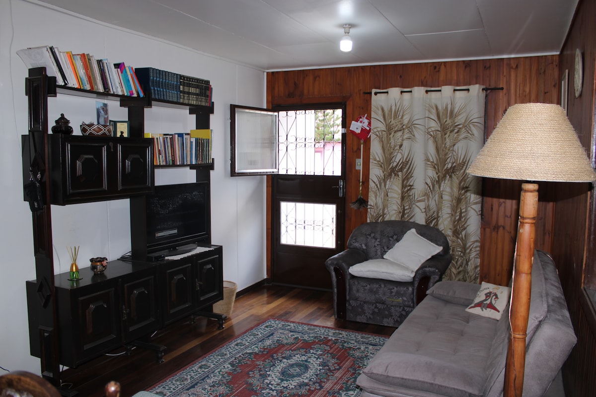 Chalé aconchegante no bairro São Bernardo, menos de 4km da Unipampa e 4 km do centro da cidade, a 450m da avenida Santa Tecla, principal via de acesso à cidade. Cozinha com todos os utensílios necessários para o preparo de refeições. Quarto com TV Smart 32", ar-condicionado quente/frio, internet de 700MB Casa totalmente independente, com pátio todo murado e vaga para vários carros. Ideal para famílias, possui uma cama de casal e um colchão de solteiro extra, dispostos em um mesmo quarto.