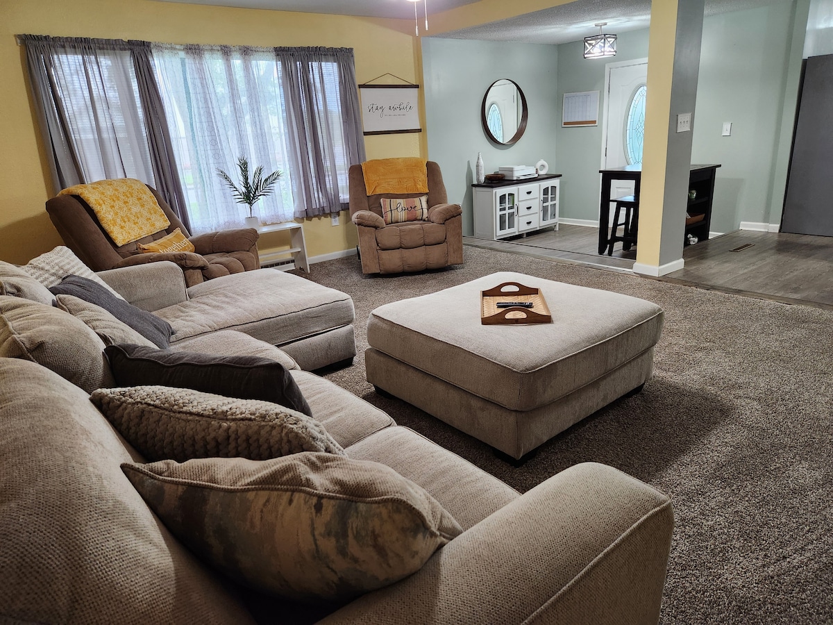 ¡Amplia casa de 4 dormitorios! ¡Descuentos semanales y mensuales! Mucho espacio para 8 huéspedes. La cómoda sala de estar y comedor es un espacio perfecto para reunirse con familiares y amigos. Asar a la parrilla en el patio es una excelente manera de disfrutar del tranquilo patio trasero vallado. Ubicación céntrica, a pocos pasos del centro de Bluffton, a 3 cuadras del hospital. Disfruta a poca distancia a pie de la cafetería, la cervecería y las boutiques del centro de la ciudad. El sendero River Greenway está a unas cuadras siguiendo el hermoso río Wabash.