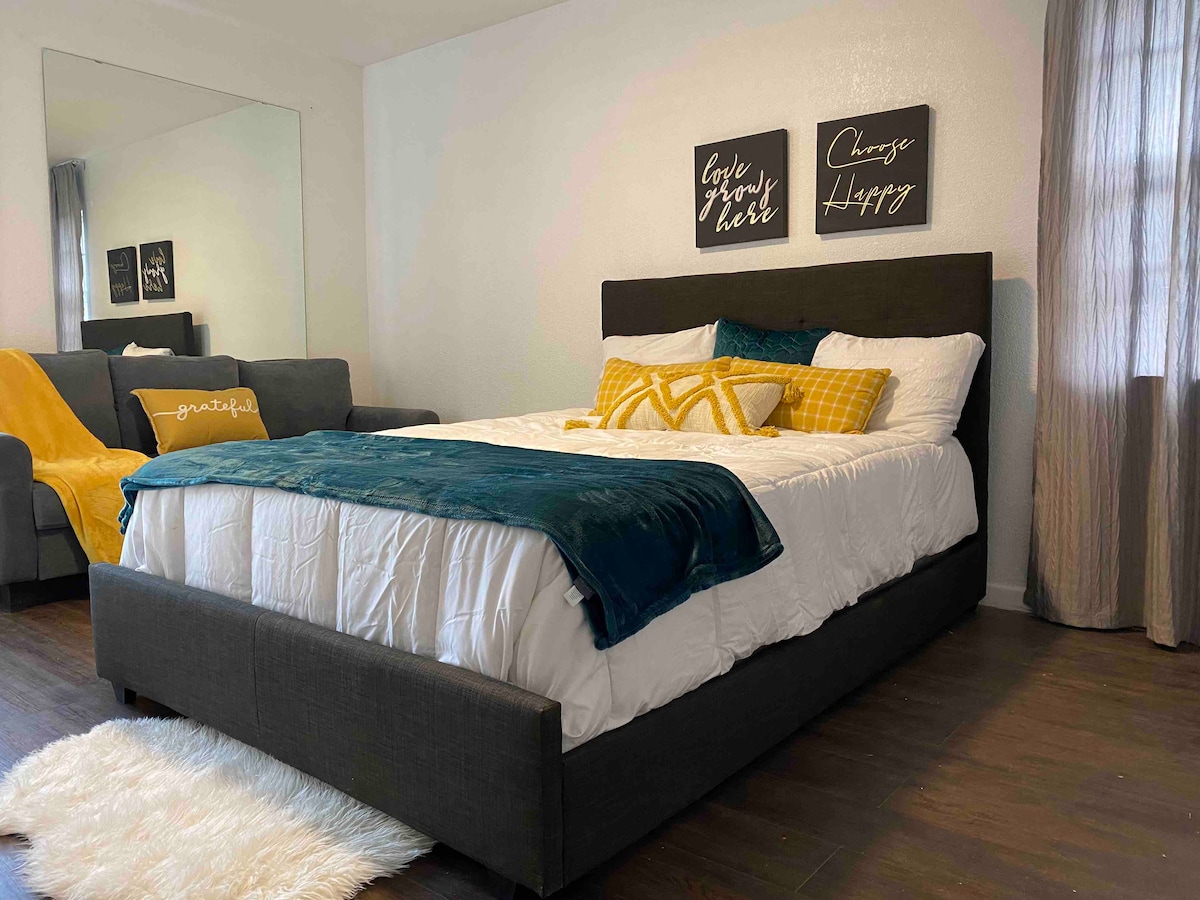 1 dormitorio con cama king y gran patio trasero vallado. Se admiten mascotas.