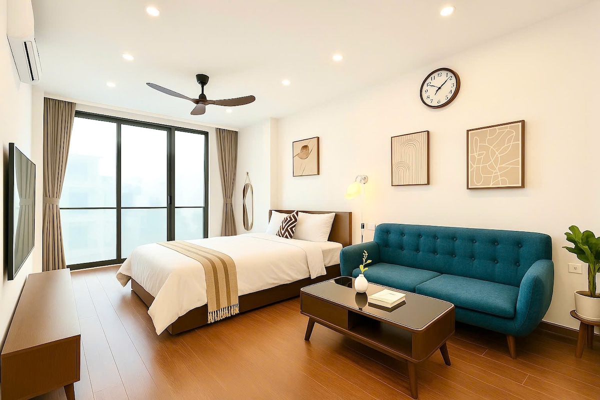 Hello! Your studio apartment is 38m2 high-class like a luxurious and charming 5-star hotel with a comfy bed, private bathroom, kitchenette and a balcony overlooking the West Lake. Especially, you have access to a high-class gym, swimming pool and sauna. Are you traveling, on business trip or simply looking for a private and romantic place? It is a great choice for you, Let’s come and experience! We’re excited to see you here! Best regards, Luxury Econest team