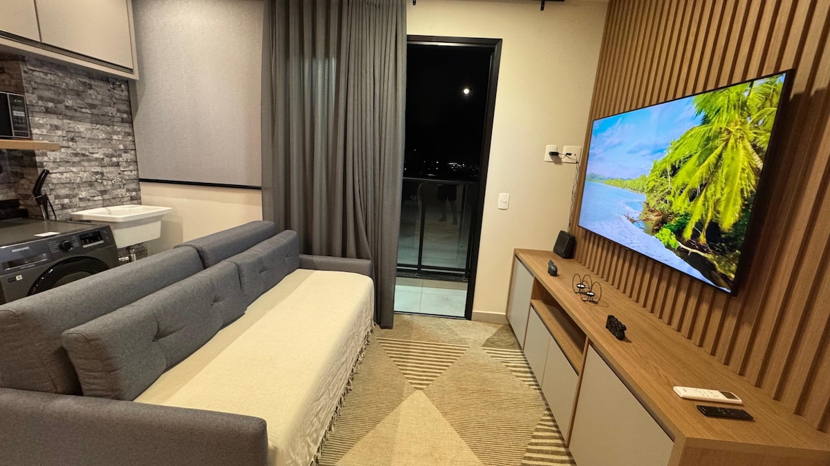 Aproveite uma estadia confortável neste cantinho preparado com muito carinho. O espaço de 1 quarto é moderno, iluminado e pensado para que você se sinta em casa. A sala conta com TV smart e um ambiente acolhedor p/ relaxar. A cozinha é equipada com o essencial e o quarto oferece cama confortável, roupas de cama, itens básicos e ar-condicionado. A localização é ótima, perto de tudo que você precisa. Cada detalhe foi preparado c/ cuidado para que sua experiência seja leve e agradável. 💛