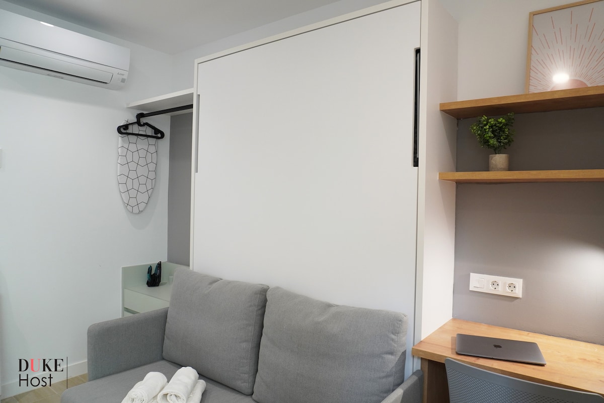 Estudio interior para 2 personas en un aparthotel moderno con 24 unidades, cada una con baño y cocina integrada. Esta unidad está clasificada como Interior, pero cuenta con luz natural. Incluye Wi-Fi, secador de pelo, bomba de calor, aire acondicionado y TV. La cocina abierta dispone de placa de inducción, nevera, microondas, congelador, vajilla, cafetera y hervidor. Los huéspedes pueden usar la lavandería compartida con lavadoras y secadoras dentro del aparthotel.