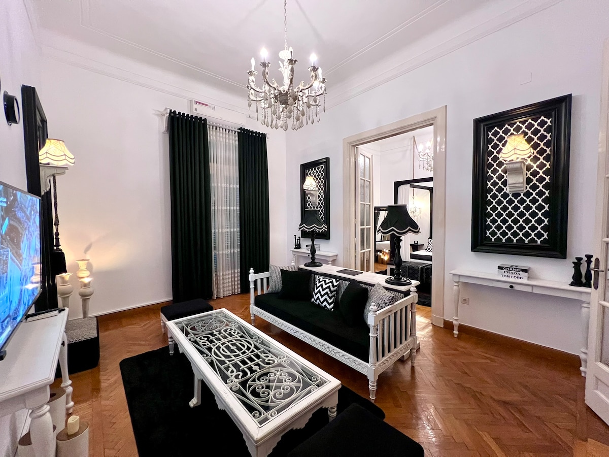 Bienvenido a nuestro céntrico refugio histórico ubicado en el corazón del centro de El Cairo. donde el encanto vintage y elegante se encuentra con la comodidad moderna. Entra en la era egipcia del Khedival al entrar en nuestro apartamento familiar, con techos altos y gloriosos detalles arquitectónicos que evocan la grandeza de los años de antigüedad.