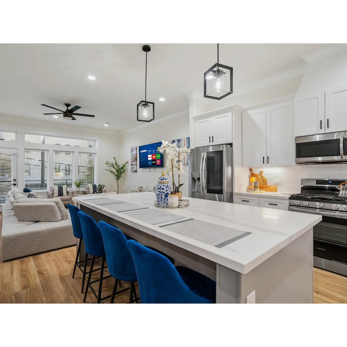 3100 pies cuadrados de vida de lujo en Woodland Heights, ubicado entre el tranquilo Woodland Park y el bullicioso centro de la ciudad. Daikin Park, Toyota Ctr y George R. Brown Convention Ctr a 5-10 minutos. Estadio NRG a 18 minutos. WIFI RÁPIDO DE 300 mbps. Vistas espectaculares. Casa de 4 niveles con 2 patios, lanai cubierto, patio trasero y terraza en la azotea. 4 dormitorios, 3,5 baños y garaje. Cocina de diseño totalmente equipada y puertas de vidrio de acordeón para una vida interior/exterior perfecta. Acceso a kilómetros de senderos para caminatas y bicicletas a pocos pasos de la puerta principal.