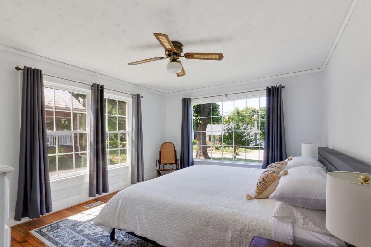 La Carriage House y la ciudad de Morganton tienen energía y están listas para los visitantes. Esta casa de huéspedes se encuentra detrás de una casa histórica en el centro de Morganton. La estructura de la década de 1920 ha restaurado los acabados originales: una bañera con patas, un lavabo de baño vintage y un fregadero de casa de campo en la cocina. La planta baja cuenta con techos originales de tableros de madera. Arriba se quitó el techo para dejar al descubierto el tejado y las vigas. Dos chimeneas lo mantienen acogedor: tendrás un lugar encantador para relajarte y escuchar la lluvia en el techo de metal.