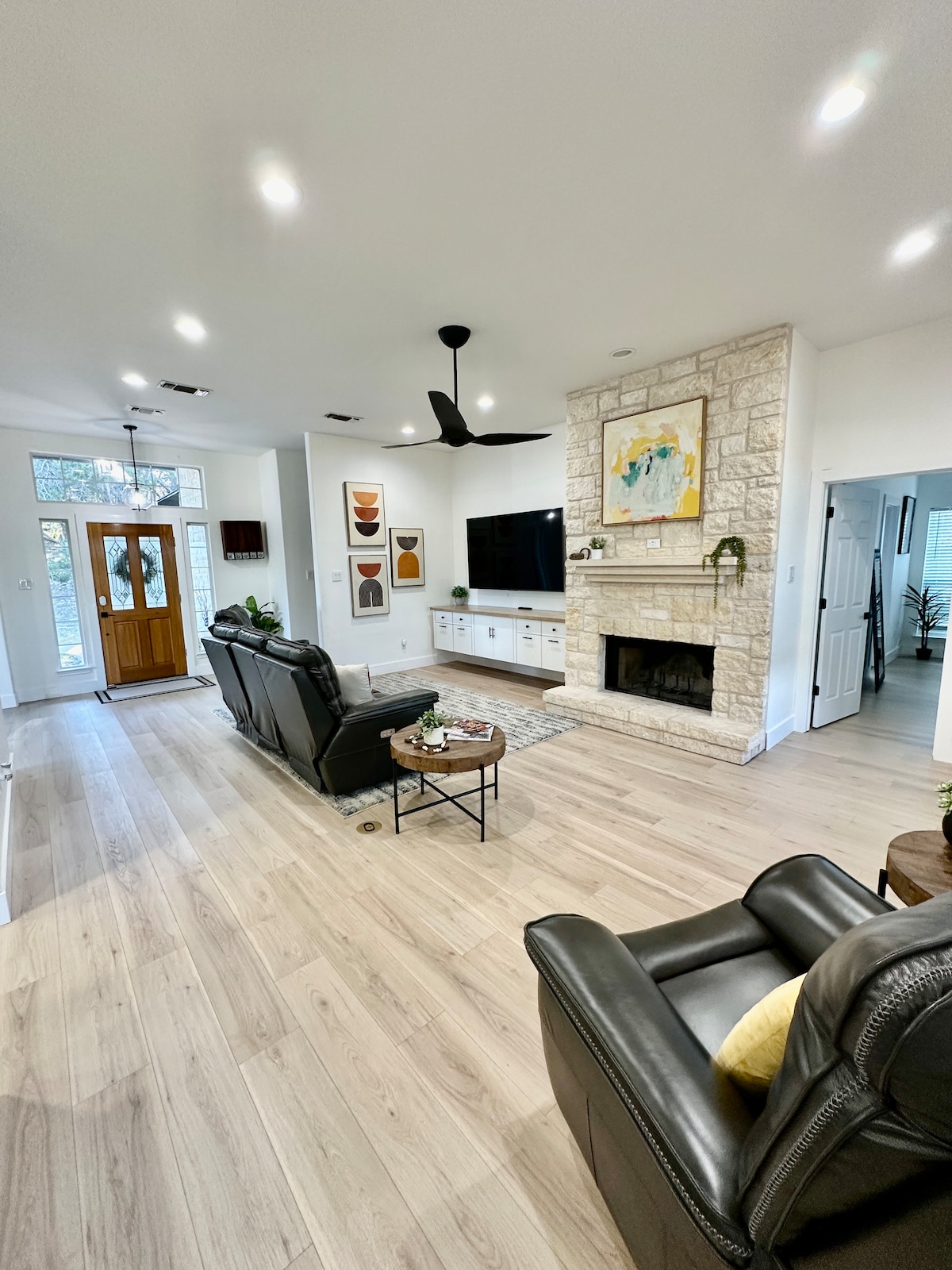 Esta casa personalizada de granja de Texas se encuentra en el centro de Dripping Springs, a pocos pasos de las tiendas y restaurantes de nuestra bulliciosa ciudad pequeña. Con una gran planta abierta y un gran porche trasero, esta casa le ofrece a tu familia mucho espacio para relajarse y disfrutar del tiempo en familia. El porche trasero es una sala de estar cubierta al aire libre con chimenea, TV y una mesa larga para pasar el rato. Además, en el patio trasero hay lavaderos y un parque infantil que ofrecen entretenimiento para todas las edades.