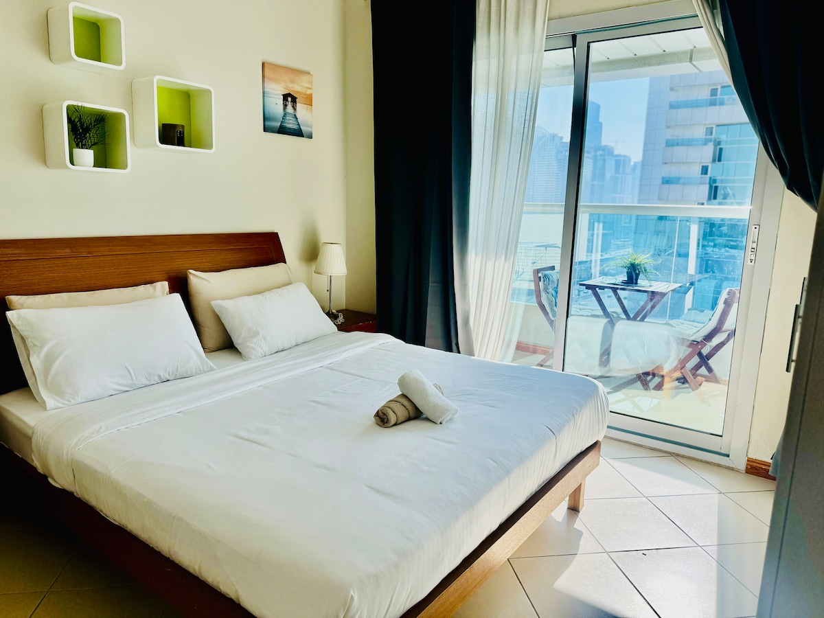 Te damos la bienvenida a Marvel Stay. Disfruta de este maravilloso estudio ubicado en Sparkle Towers en la famosa Marina de Dubai, el punto turístico más buscado de Dubai. ¡Estás en medio de todo! Camina 5 minutos hasta la popular playa de JBR, come en restaurantes elegantes, pasea por el prominente paseo marítimo de Dubai o disfruta de las comodidades del edificio (piscina, sauna, gimnasio). Ubicado junto al tranvía (estación Jumeirah Beach Residence) que se conecta con el metro de Dubai, lo que proporciona comodidad de transporte.
