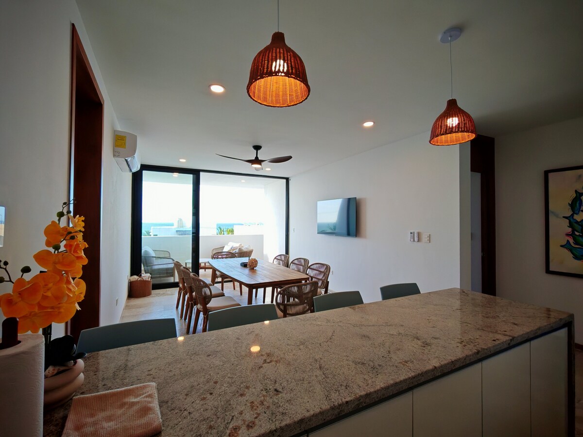 Exclusivo departamento de lujo frente al mar, con vista directa al mar desde el comedor para 8 personas. Amueblado totalmente con acabados de la mejor calidad, ofreciendo espacios amplios y acogedores. Ubicado en Turena, condominio más nuevo de la Costa Yucateca, en residencial Kinuh (Telchac Puerto).