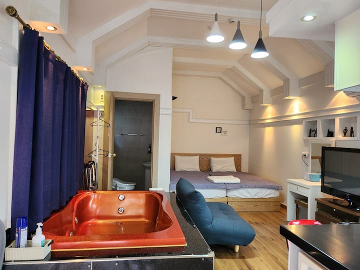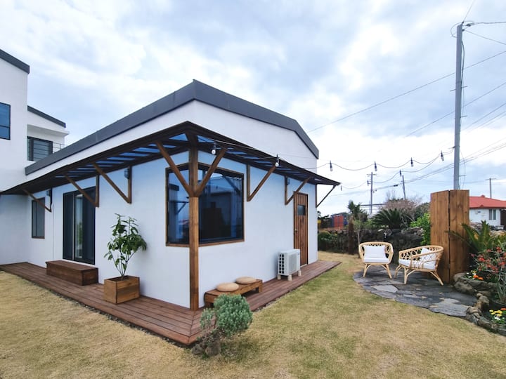 Jardín privado/bañera al aire libre con agua caliente gratuita/sala de comedor de altura y cocina blanca en un piso elevado