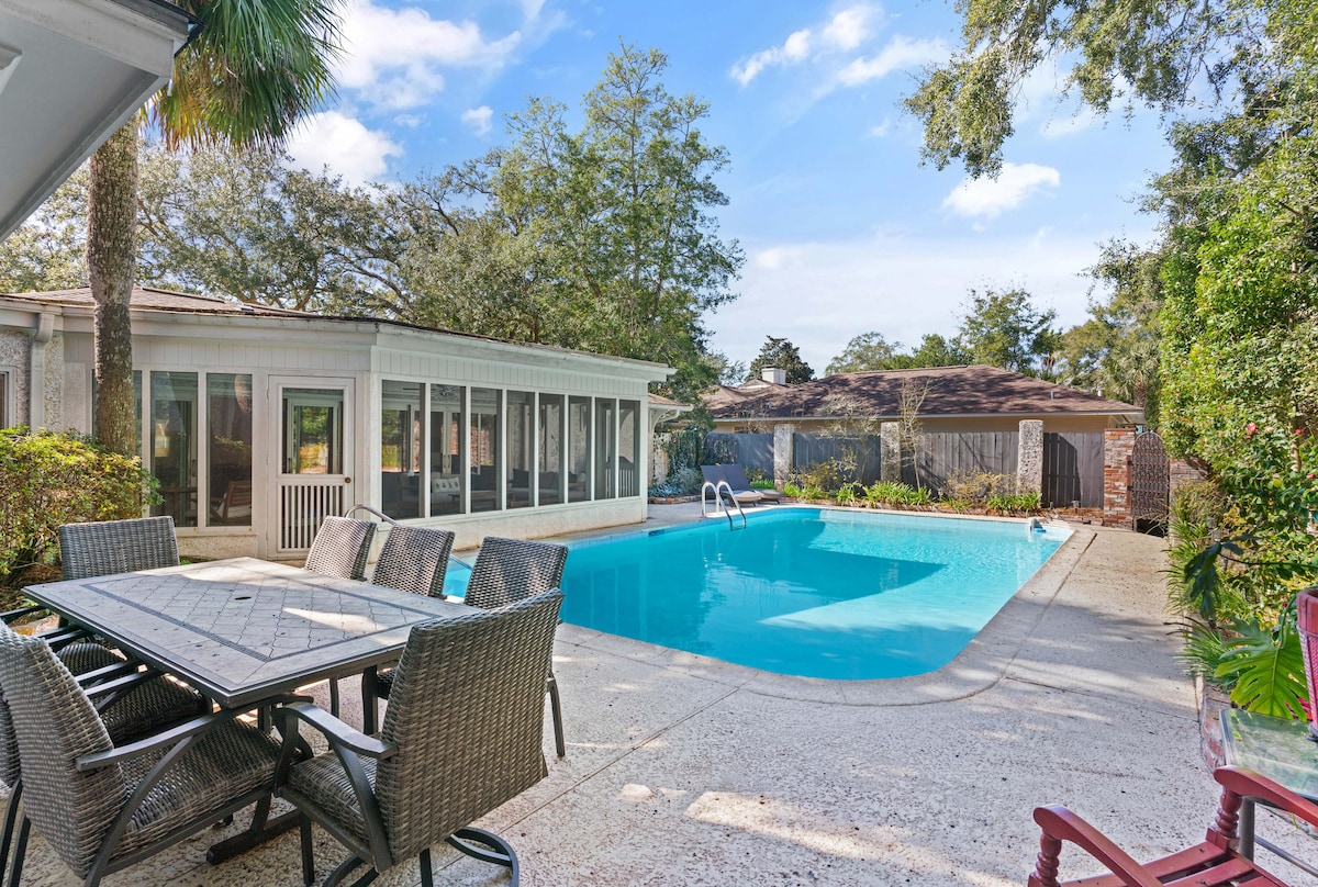 Deja que Kendall Cottage sea tu campamento base mientras exploras los tesoros de la isla Jekyll. Disfruta del silencio de la mañana con un café en el patio trasero con mosquitero con vista a la piscina privada climatizada. Monta en bicicleta, corre o pasea por los senderos del lado del pantano, justo al final de la entrada. Relájate junto a la piscina dentro del recinto de la catedral lanai. Prepara comidas en la cocina renovada y bien equipada. Disfruta de una puesta de sol en la puerta principal y acomódate para disfrutar de una noche relajante con una película, un juego o un libro de tu elección.