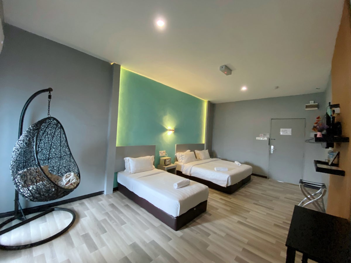 Es la habitación más grande del Motel Arsahrin, que se encuentra en el primer piso. El balcón delantero tiene su propia arena para gatos y será adecuado para que tus gatos se queden. Hay una lavadora en el balcón trasero si necesitas lavar la ropa. También proporcionamos una estufa pequeña, solo para cocinar ligeramente y un mini refrigerador para mantener tus bebidas frescas. Mi esposa y yo solíamos quedarnos aquí y amamos a los gatos. Es un lugar apto para gatos. Espero que te encante la habitación tanto como a nosotros. Saludos, Mu'iz Rahman