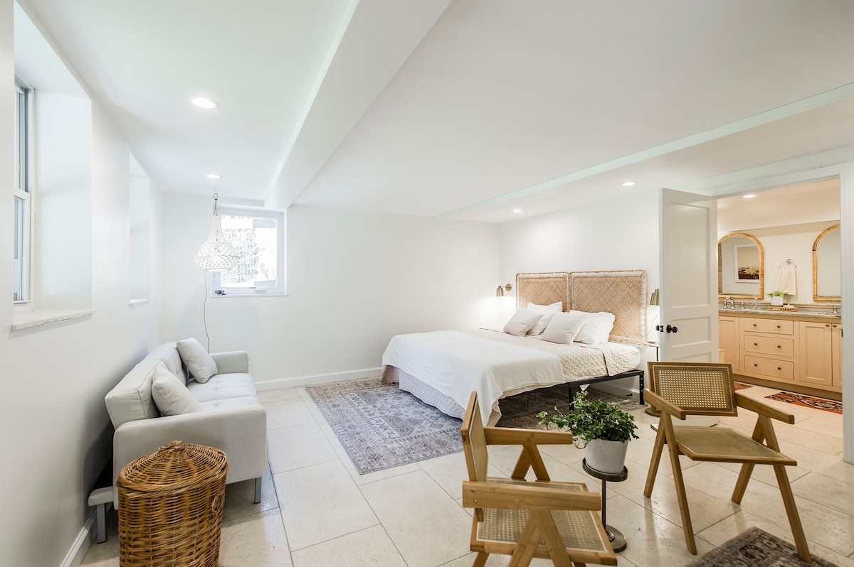 Un espacio para huéspedes artesanales de lujo, luminoso y abierto. Construido a medida y completo con una cocina completa, dormitorio tipo loft, espacio de trabajo, chimenea, papel tapiz a medida y arte local en todas partes. A medida que la luz natural se derrama a través de ventanas altas y tragaluces, el Gwyneth es el espacio perfecto para una escapada íntima a Nashville con una novia o pareja, o un retiro en solitario inspirador. Por razones de seguridad y limpieza, el espacio no se considera adecuado para mascotas o niños.