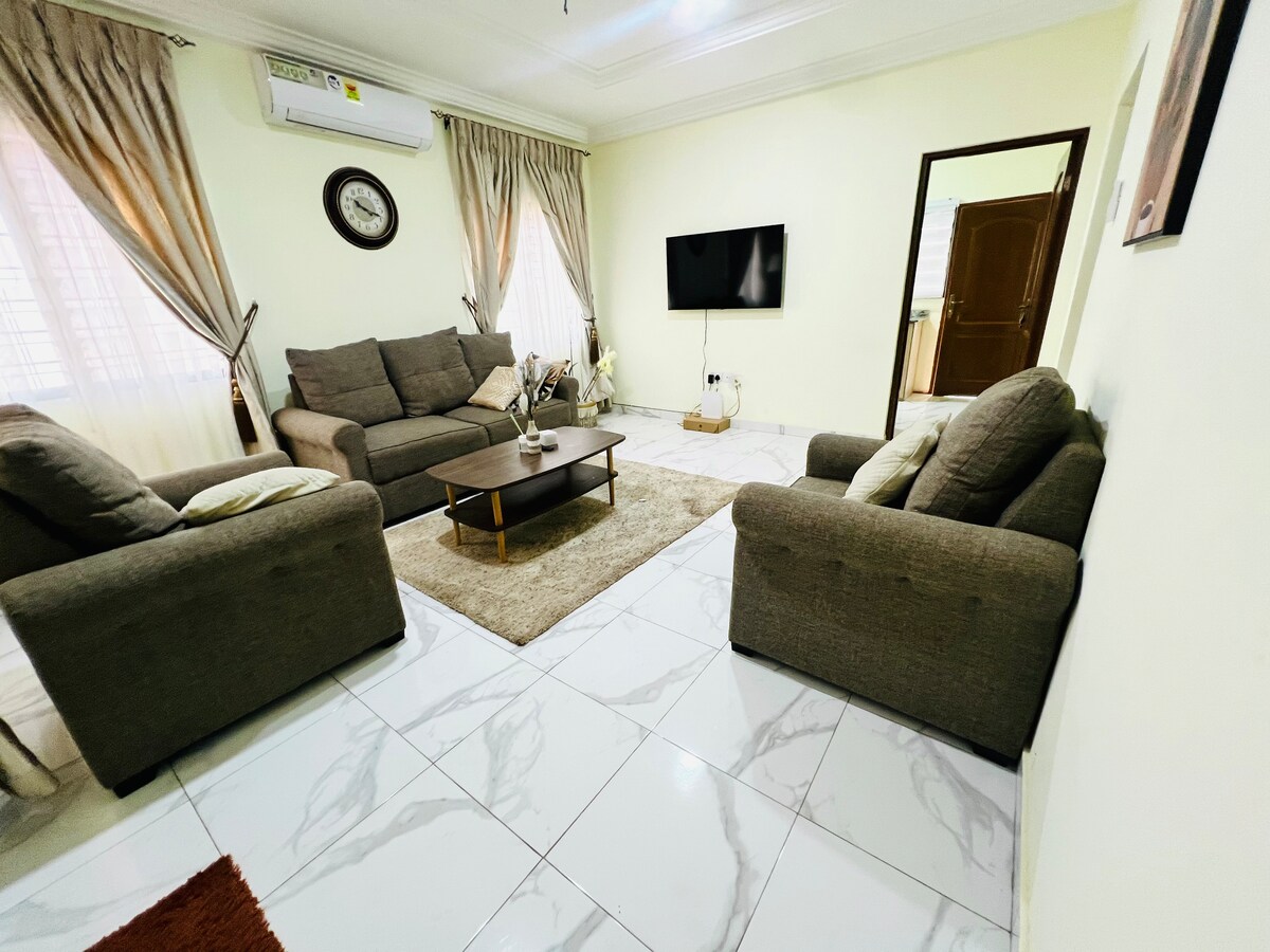 Hermoso apartamento en Babasab Resort, elegantemente amueblado y con equipo de alta calidad. Excelente ubicación en las colinas de Kwabenya, cerca de la Universidad Ashesi. Piscina, cabaña de bambú (gimnasio, tenis de mesa, pateador), terraza en la azotea con vista panorámica, barbacoa, TV y cine en casa, sistema solar, aire acondicionado, sistema de alarma. El wifi se cobra con 20 GHS cuando te mudas, cuando se agota el crédito, los huéspedes pueden hacerlo a su propio costo.