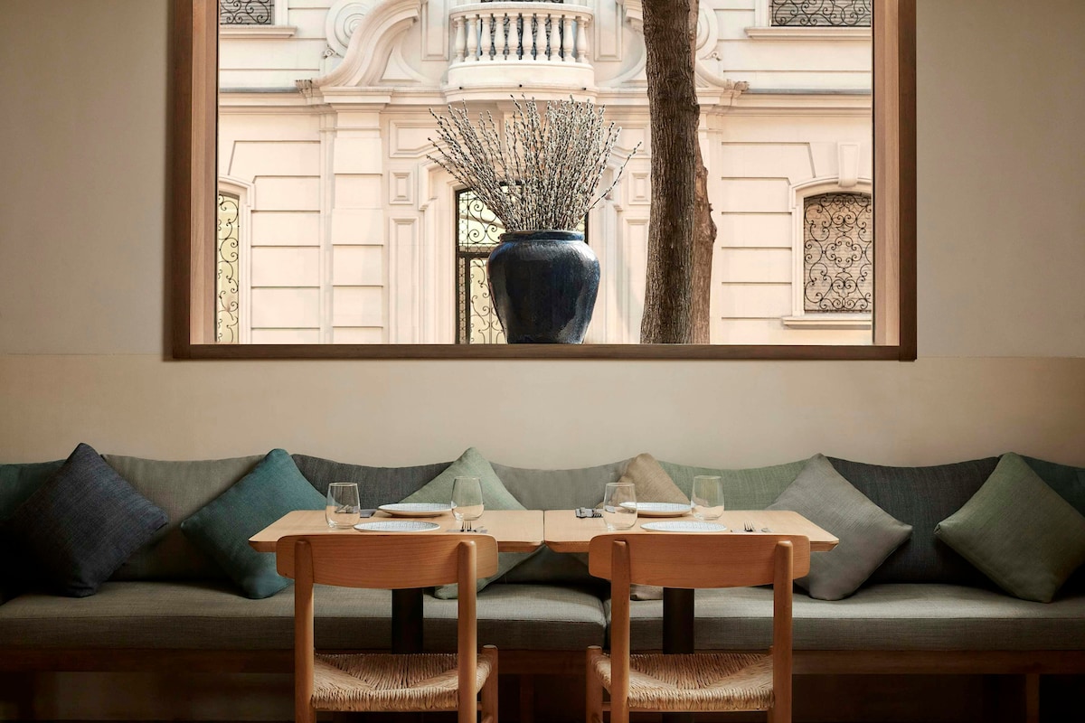Quiet, modern 16–20 m² room with Ac, free Wi-Fi, minibar, safe, pillow menu, and full bathroom. Centrally located in Chamberí near Paseo de la Castellana and metro links. Enjoy on-site gym, Mediterranean restaurant, lobby bar, and 24-hour reception. Buffet breakfast and secure parking available for an extra charge.
