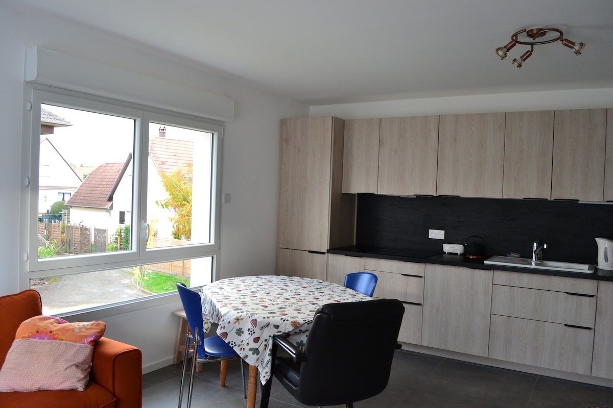 A 15 minutos del centro de Estrasburgo en coche, el estudio de 24 metros cuadrados amueblado a tu disposición, tendrás una gran mesa y un armario, una cama, una pequeña cocina americana con todo lo necesario (cubiertos, platos, nevera, placa eléctrica). Una gran ventaja son las plazas de aparcamiento dentro de la propiedad.