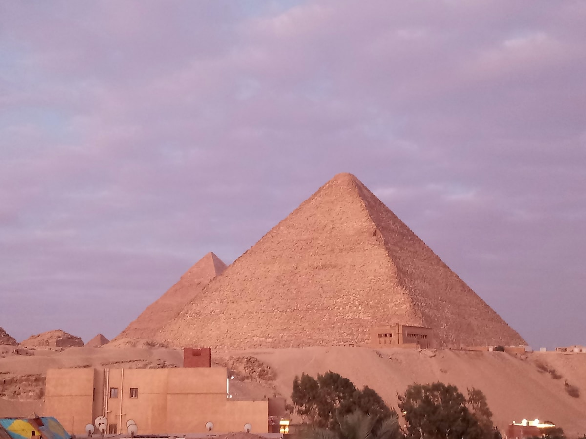 Amplia habitación doble con balcón privado frente a las pirámides (4.º piso). La habitación incluye aire acondicionado, TV, nevera, hervidor de agua, así como café, té y agua de cortesía (plancha gratuita previa solicitud). El baño incluye toallas, secador de pelo y champú, jabón y gel de ducha de cortesía. El precio incluye desayuno egipcio casero preparado a diario y servido en la azotea de 8:00 a 10:00 a. m.