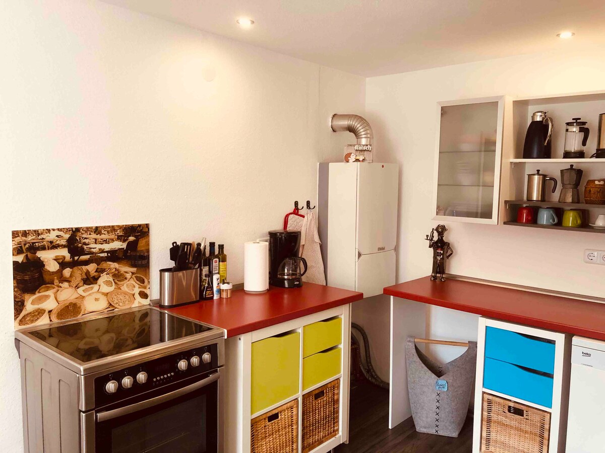 - Apartamento de aprox. 45 metros cuadrados totalmente renovado en 2016 con porche en las afueras de la gran ciudad. - 1x espacio de estacionamiento para huéspedes frente a la casa - Dormir tranquilo - Baño moderno con ducha a ras del suelo. - Buena conexión con Messe/Deutz (ver transporte), así como con el moderno, multicultural y alternativo distrito de Ehrenfeld. - A 20 minutos del centro de Colonia. - Conexión de tren S19 Technologiepark Müngersdorf (10 minutos a pie), línea de metro 3+4 (15 minutos a pie)