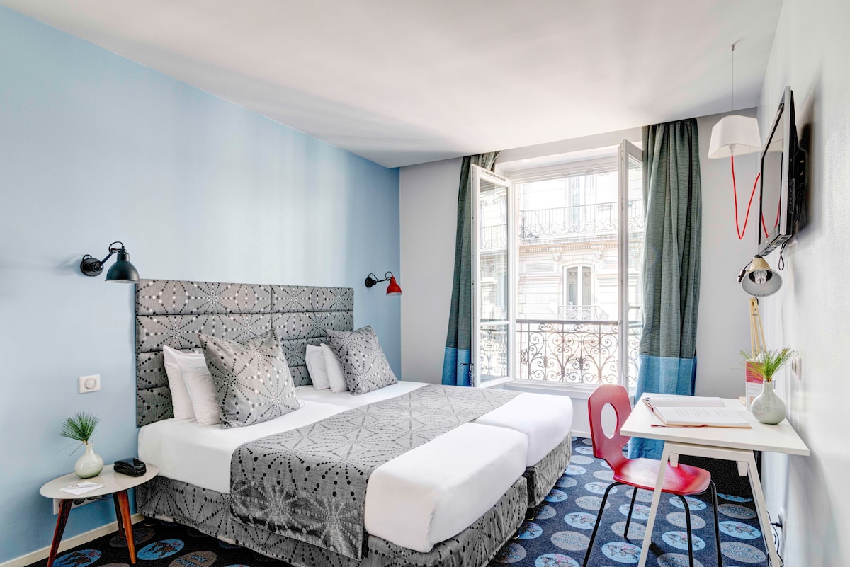 Habitación de Dos camas con baño privado en el hotel Joke***, un hotel boutique de 3 estrellas perteneciente al grupo Astotel e idealmente situado en el centro del distrito 9 de París, cerca de Montmartre, los grandes almacenes, la Ópera Garnier y del transporte público. Recepción abierta 24 horas. Puedes dejar gratuitamente el equipaje durante todo el día de llegada y de salida.