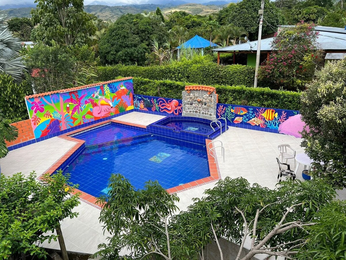 ¡Descubre Casa Finca Mercedes en el condominio Valle de la Rivera, a solo 1 km de Rivera, Huila! Con capacidad para 15 personas, ofrece tres habitaciones, aire acondicionado, ventiladores, tres baños, kiosco paisa y terraza chill out. Pero lo más destacado es su impresionante piscina . ¡Tu oasis en Huila te espera! Wifi disponible