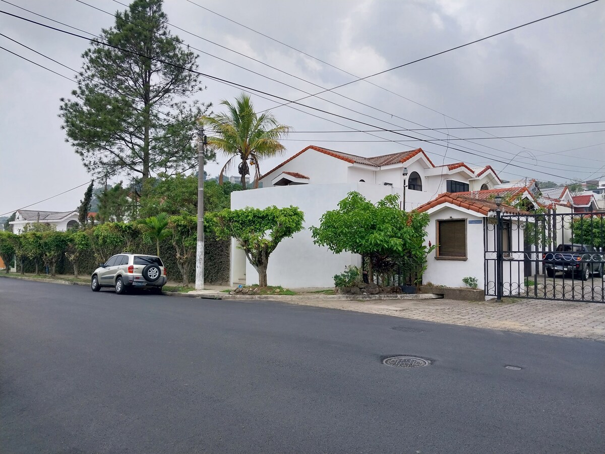 Muy bonita casa en una plaza cerrada tranquila y privet, guardias de seguridad 24/7. La casa está en la cima de una colina, con excelentes vistas, rodeada de montañas, a solo unos minutos de la ciudad, cerca de los principales centros comerciales de San Sal. 45 minutos a las ruinas arqueológicas mayas de San Andrés, a 30 minutos de San Sal. Volcán, a 45 minutos de las playas más famosas de El Salvador, las distancias son aprox. en coche. Ofrecemos aire acondicionado en E/habitación por cargos adicionales.$ 5 por día por E/ habitación o $ 25 por semana por habitación.