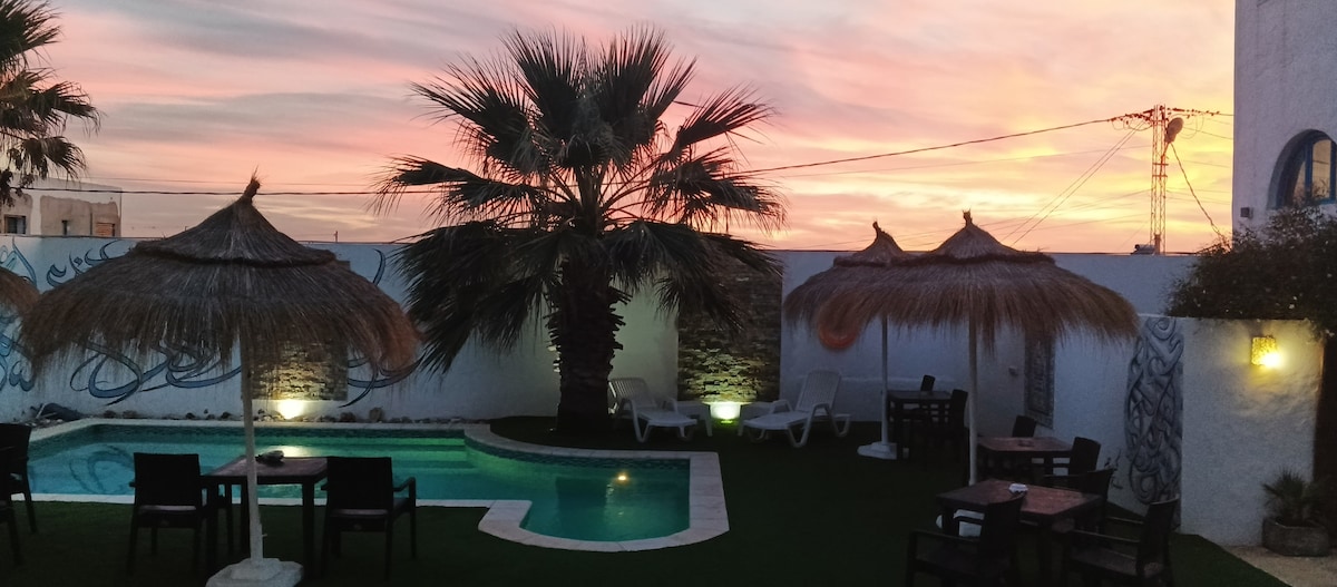 Relájese en este alojamiento único y tranquilo. A diez minutos a pie de la hermosa playa azul de El Hawaria y bajo una hermosa colina, la casa azul espaciosa y cómoda sin vecinos enfrente le permite un cambio de escenario total. Esta zona rural le permite disfrutar de la naturaleza de los animales y la tranquilidad mientras tiene todas las comodidades necesarias para una estadía agradable. La piscina de un tamaño de 8 metros por 5 metros agrega una gran ventaja a su estancia