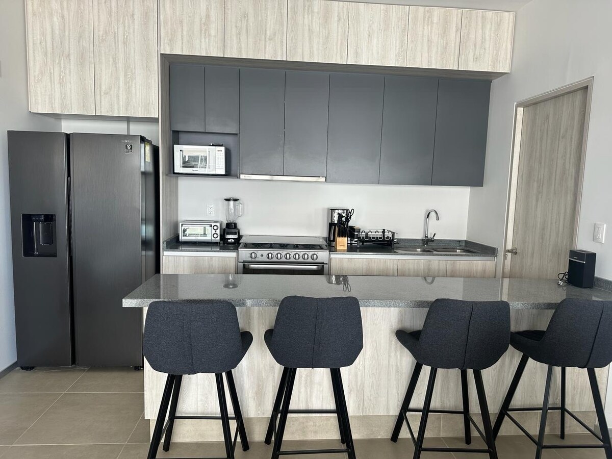 Departamento nuevo y moderno con acabados de lujo, con dos recamaras con cama matrimonial y closet cada una. *La televisión (chica) de la recamara principal (1) sólo cuenta con YouTube y Netflix, la televisión (grande) de la recamara 2 cuenta con VIX, Netflix y YouTube. Cocina y comedor. Es una zona tranquila y segura, ideal para pasar unos días fuera del ruido de la ciudad. El departamento se reserva completo. Para trasladarse hay servicio de transporte público, Uber y taxis.