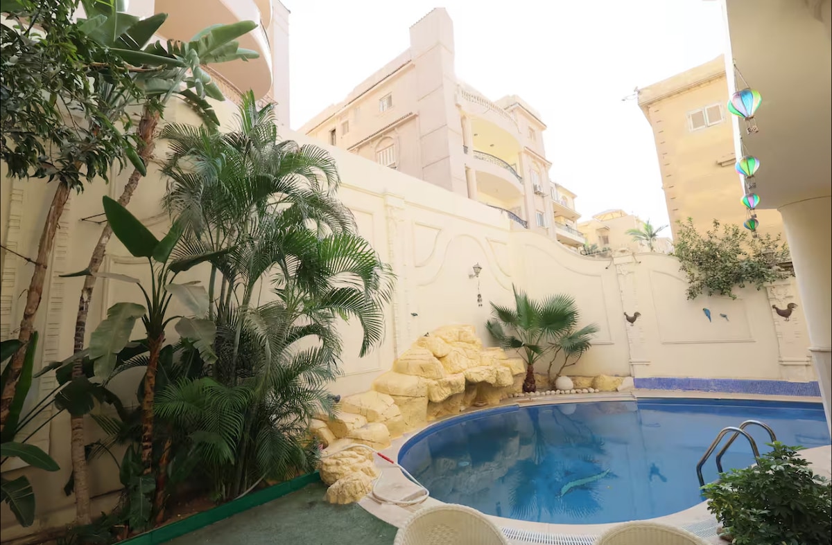 Un APARTAMENTO ENTERO con un jardín trasero situado en una zona hermosa y verde en una comunidad pacíficamente integrada que satisface todas las necesidades de los residentes. Las habitaciones están recién amuebladas, con aire acondicionado, TV inteligente y todas las comodidades que puedas necesitar, superLIMPIO y TRANQUILO. El apartamento está a 25 minutos del Aeropuerto Internacional de El Cairo. Cafeterías, restaurantes, supermercados y farmacias están cerca. Calidad de hotel con comodidad hogareña ofrecida a un PRECIO RAZONABLE.